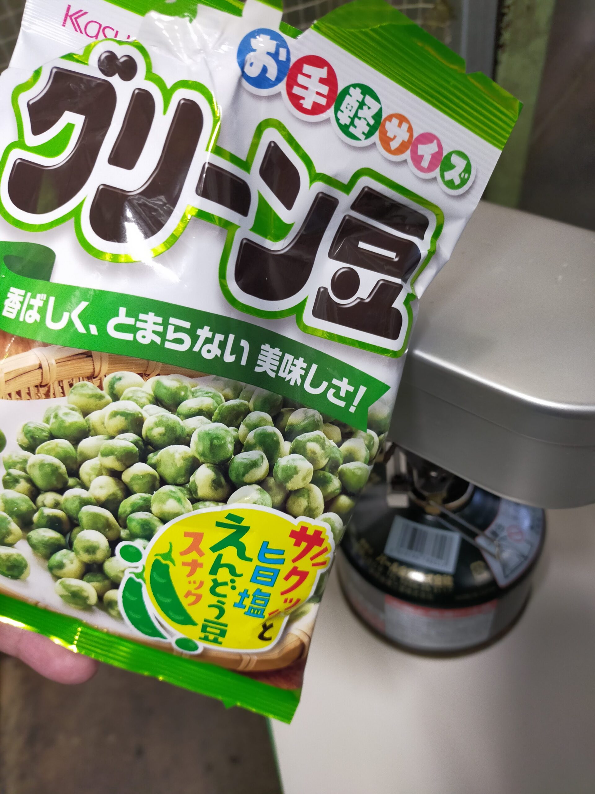 使用したのは、スーパー・コンビニ等にスナック菓子として販売している春日井製菓の「グリーン豆」